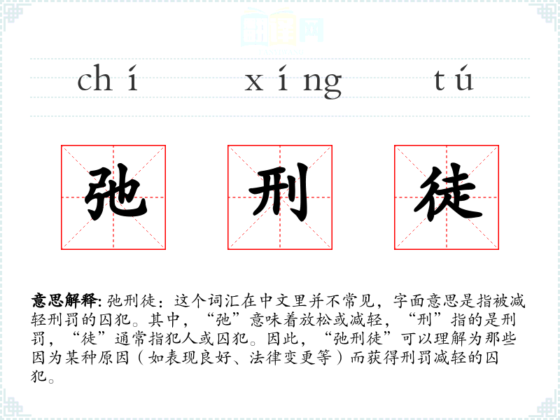 弛刑徒:这个词汇在中文里并不常见,字面意思是指被减轻刑罚的囚犯。其中,“弛”意味着放松或减轻,“刑”指的是刑罚,“徒”通常指犯人或囚犯。因此,“弛刑徒”可以理解为那些因为某种原因(如表现良好、法律变更等)而获得刑罚减轻的囚犯。