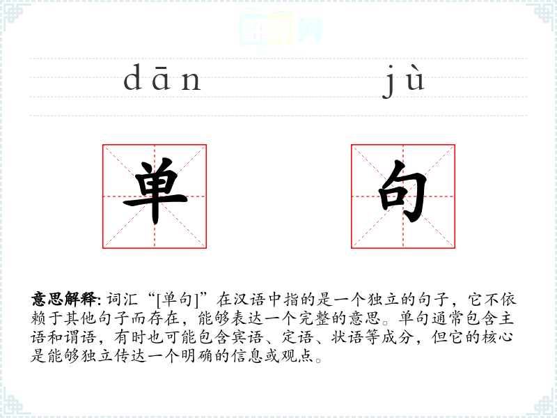 词汇“[单句]”在汉语中指的是一个独立的句子,它不依赖于其他句子而存在,能够表达一个完整的意思。单句通常包含主语和谓语,有时也可能包含宾语、定语、状语等成分,但它的核心是能够独立传达一个明确的信息或观点。
