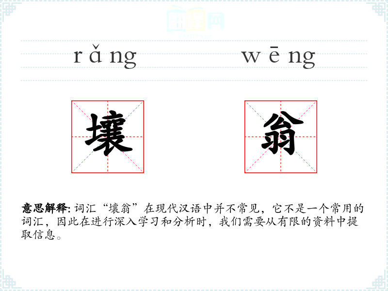 词汇“壤翁”在现代汉语中并不常见,它不是一个常用的词汇,因此在进行深入学*和分析时,我们需要从有限的资料中提取信息。
