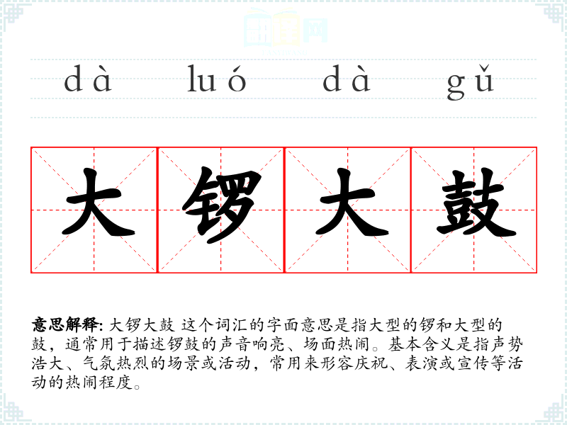 大锣大鼓 这个词汇的字面意思是指大型的锣和大型的鼓,通常用于描述锣鼓的声音响亮、场面热闹。基本含义是指声势浩大、气氛热烈的场景或活动,常用来形容庆祝、表演或宣传等活动的热闹程度。