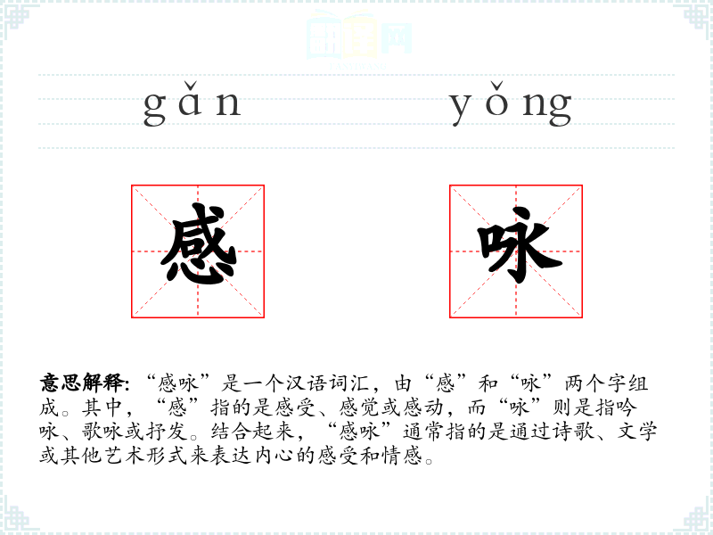 “感咏”这个词给我带来的情感反应是深沉和内省的。它让我联想到那些通过文字和艺术表达深刻情感的诗人和艺术家,以及他们作品中蕴含的丰富情感和智慧。