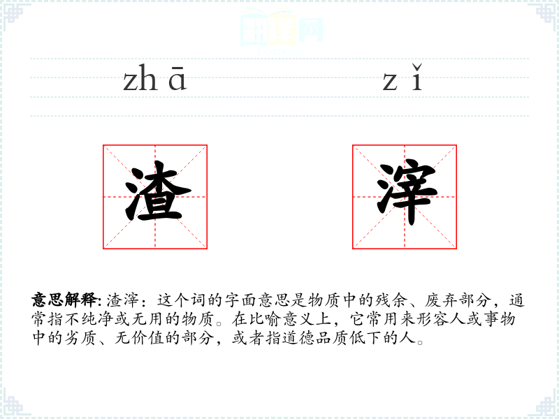 渣滓:这个词的字面意思是物质中的残余、废弃部分,通常指不纯净或无用的物质。在比喻意义上,它常用来形容人或事物中的劣质、无价值的部分,或者指道德品质低下的人。