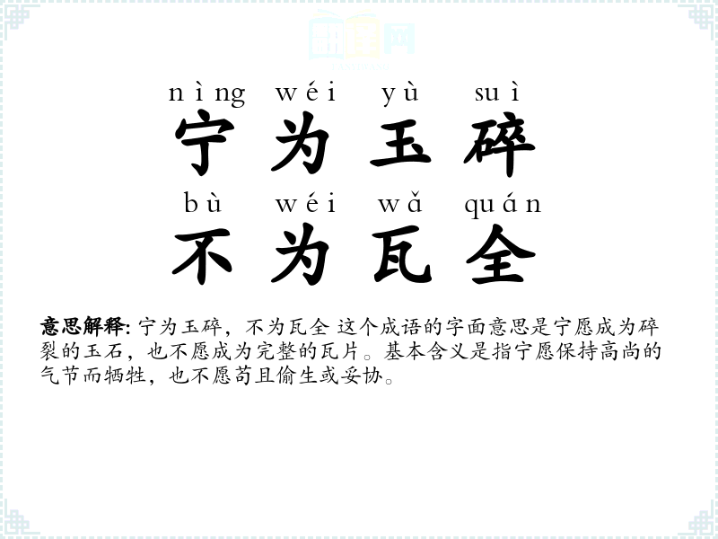 宁为玉碎,不为瓦全 这个成语的字面意思是宁愿成为碎裂的玉石,也不愿成为完整的瓦片。基本含义是指宁愿保持高尚的气节而牺牲,也不愿苟且偷生或妥协。