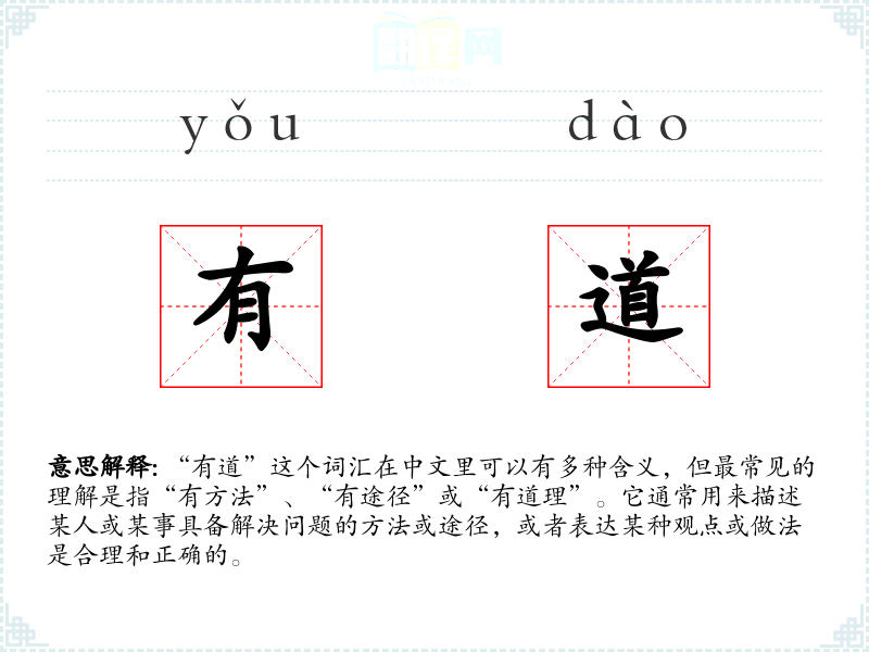 在英语中,“有道”可以对应为“methodical”或“effective”,但这些词汇可能没有“有道”在中文中所包含的道德和哲学内涵。