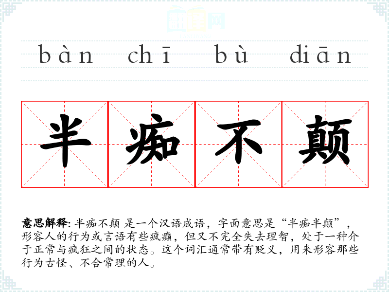 半痴不颠 是一个汉语成语,字面意思是“半痴半颠”,形容人的行为或言语有些疯癫,但又不完全失去理智,处于一种介于正常与疯狂之间的状态。这个词汇通常带有贬义,用来形容那些行为古怪、不合常理的人。
