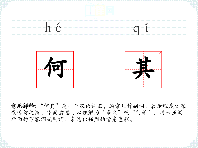“何其”是一个汉语词汇,通常用作副词,表示程度之深或惊讶之情。字面意思可以理解为“多么”或“何等”,用来强调后面的形容词或副词,表达出强烈的情感色彩。