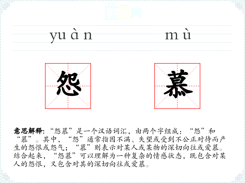 “怨慕”作为一个复合词,其构成部分“怨”和“慕”在古代汉语中已有使用。随着时间的推移,这两个字结合在一起,形成了描述复杂情感的词汇。在古代文学作品中,如诗词和小说,这个词汇已有出现,并在现代汉语中继续被使用。