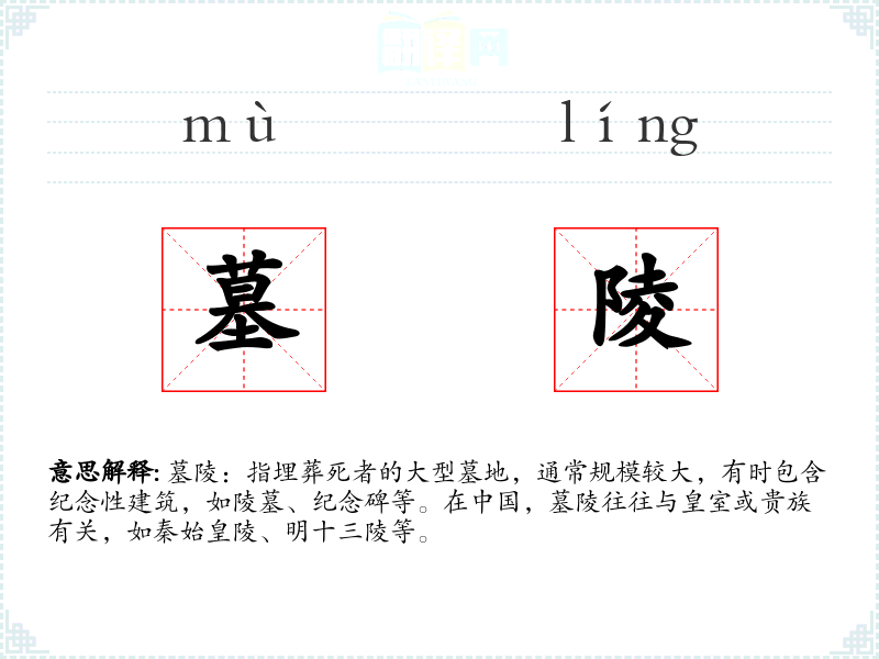 - 口语:在日常口语中,墓陵可能更多地指代大型墓地或历史遗迹,用于描述某个地方的历史或文化价值。