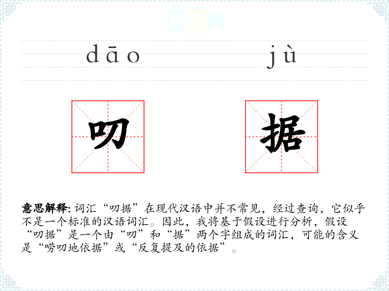 词汇“叨据”在现代汉语中并不常见,经过查询,它似乎不是一个标准的汉语词汇。因此,我将基于假设进行分析,假设“叨据”是一个由“叨”和“据”两个字组成的词汇,可能的含义是“唠叨地依据”或“反复提及的依据”。