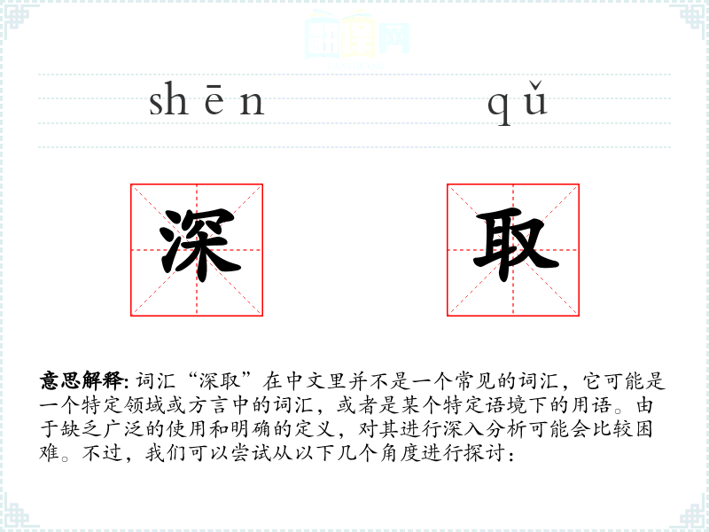 由于“深取”不是一个标准词汇,我们无法给出一个确切的基本定义。它可能是指深入地获取或提取某物,或者在某个特定领域中有特定的含义。