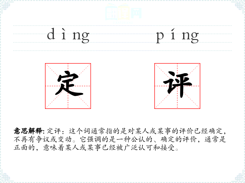 定评:这个词通常指的是对某人或某事的评价已经确定,不再有争议或变动。它强调的是一种公认的、确定的评价,通常是正面的,意味着某人或某事已经被广泛认可和接受。
