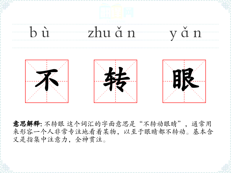 不转眼 这个词汇的字面意思是“不转动眼睛”,通常用来形容一个人非常专注地看着某物,以至于眼睛都不转动。基本含义是指集中注意力,全神贯注。