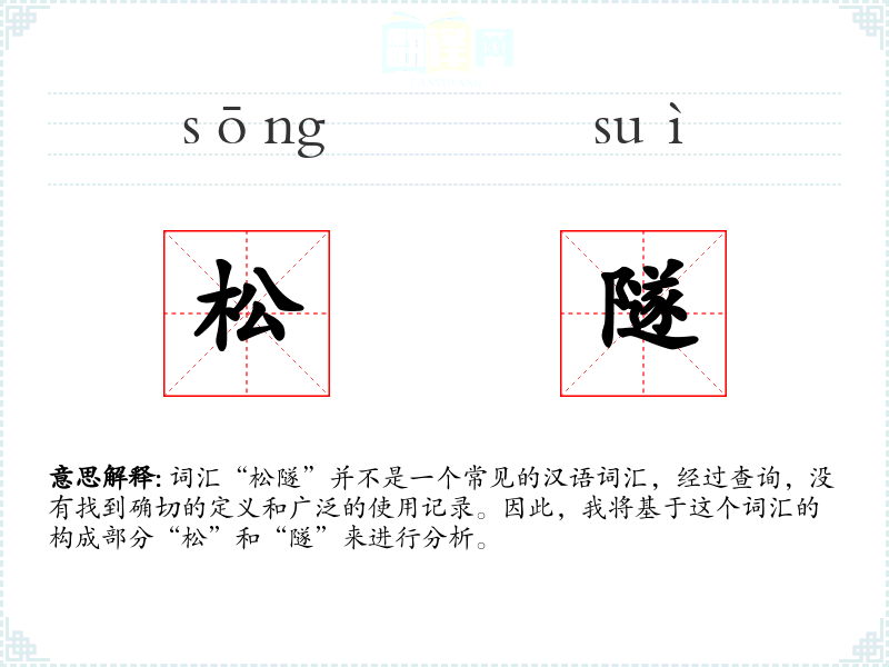 通过对“松隧”这个词汇的分析,我们可以看到它并不是一个常见的汉语词汇,但通过对其构成部分的分析,我们可以推测它可能指的是一种松散的隧道结构。在语言学习和表达中,了解词汇的构成和可能的含义有助于我们更好地理解和使用语言。