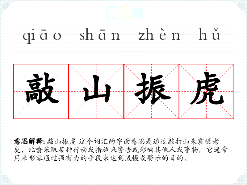 敲山振虎 这个词汇的字面意思是通过敲打山来震慑**,比喻采取某种行动或措施来警告或影响其他人或事物。它通常用来形容通过强有力的手段来达到威慑或警示的目的。
