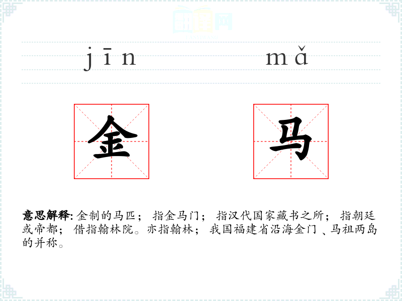 金制的马匹; 指金马门; 指汉代国家藏书之所; 指朝廷或帝都; 借指翰林院。亦指翰林; 我国福建省沿海金门﹑马祖两岛的并称。
