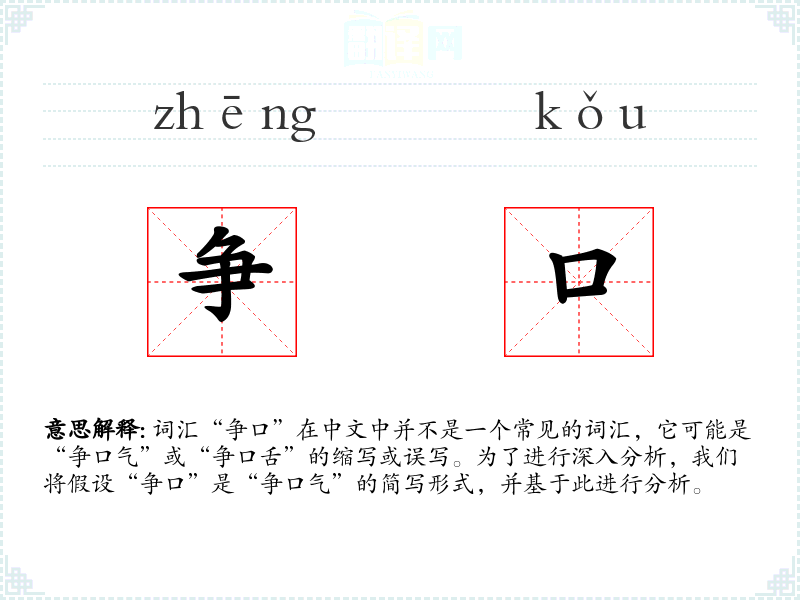 词汇“争口”在中文中并不是一个常见的词汇,它可能是“争口气”或“争口舌”的缩写或误写。为了进行深入分析,我们将假设“争口”是“争口气”的简写形式,并基于此进行分析。