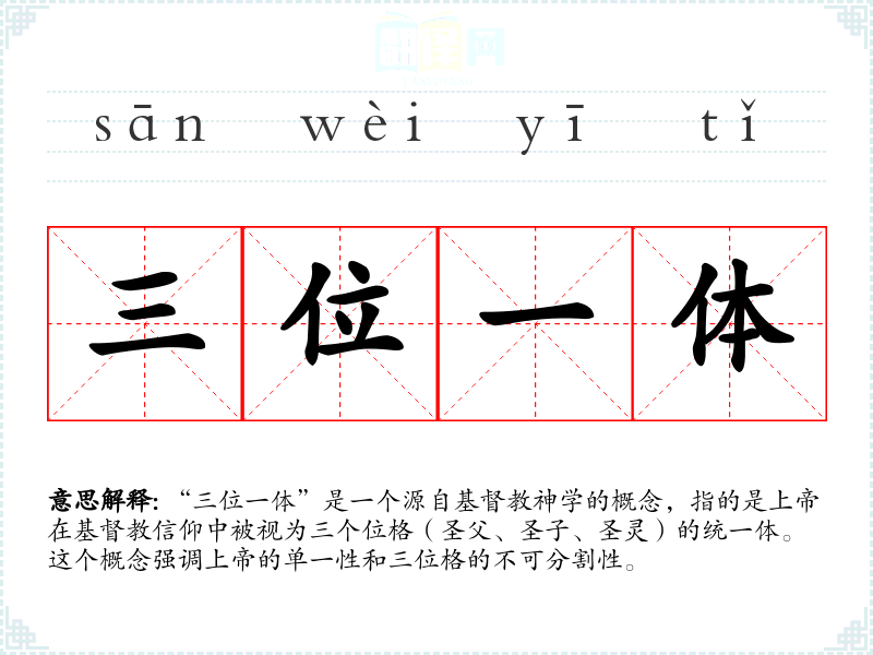 “三位一体”是一个源自教神学的概念,指的是上帝在教信仰中被视为三个位格(圣父、圣子、圣灵)的统一体。这个概念强调上帝的单一性和三位格的不可分割性。
