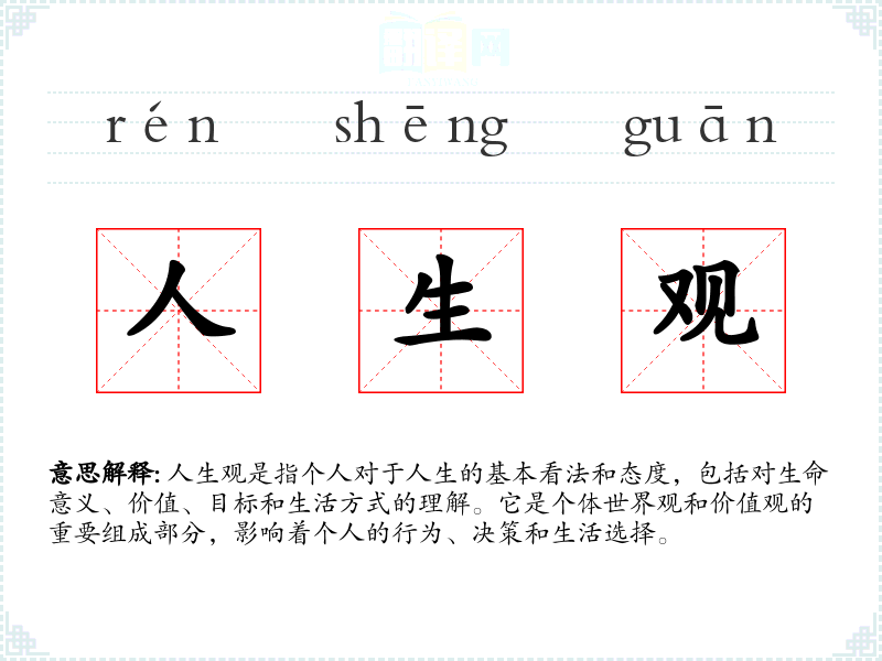 人生观一词在中文中由“人生”和“观”两个词组成。“人生”指人的一生,“观”指看法或观点。这个词在中文中的使用历史相对较短,但随着现代社会的发展,它已经成为一个常用的表达个人哲学和态度的词汇。