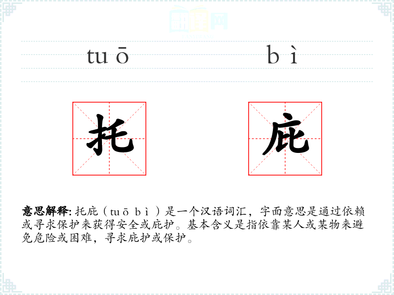 托庇(tuō bì)是一个汉语词汇,字面意思是通过依赖或寻求保护来获得安全或庇护。基本含义是指依靠某人或某物来避免危险或困难,寻求庇护或保护。
