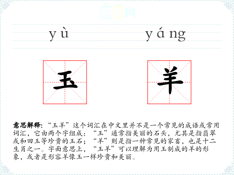 同义词:珍兽、美玉、宝羊 反义词:(由于“玉羊”不是一个常用词汇,反义词可能不明显,但可以考虑与“普通”、“平凡”相关的词汇)