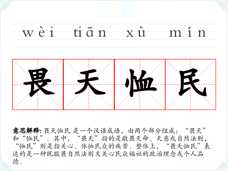畏天恤民 是一个汉语成语,由两个部分组成:“畏天”和“恤民”。其中,“畏天”指的是敬畏天命、天意或自然法则,“恤民”则是指关心、体恤民众的疾苦。整体上,“畏天恤民”表达的是一种既敬畏自然法则又关心民众福祉的政治理念或个人品德。