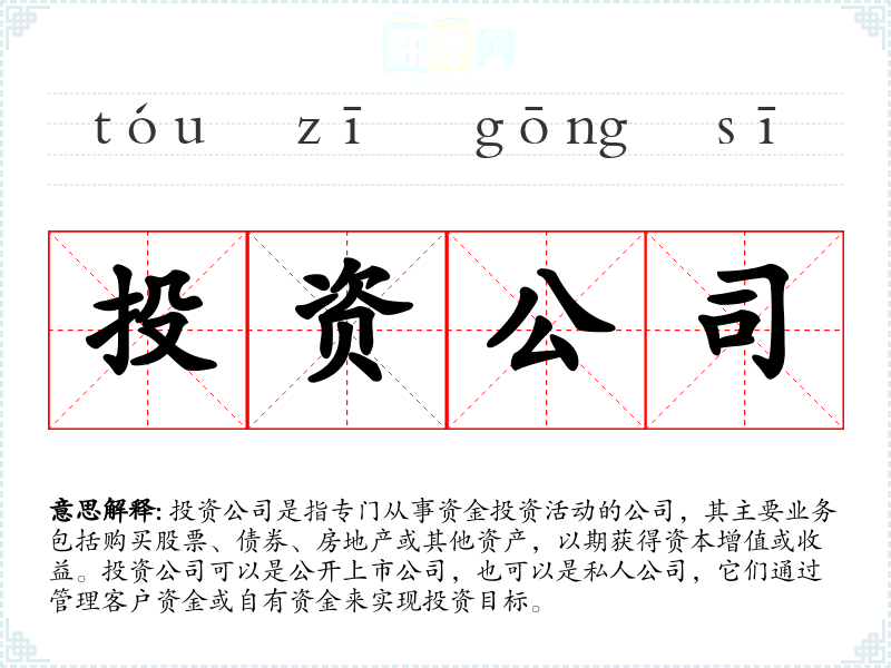 投资公司是指专门从事资金投资活动的公司,其主要业务包括购买股票、债券、房地产或其他资产,以期获得资本增值或收益。投资公司可以是公开上市公司,也可以是私人公司,它们通过管理客户资金或自有资金来实现投资目标。