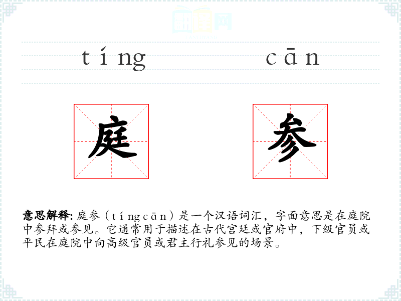庭参(tíng cān)是一个汉语词汇,字面意思是在庭院中参拜或参见。它通常用于描述在古代宫廷或官府中,下级官员或平民在庭院中向高级官员或君主行礼参见的场景。