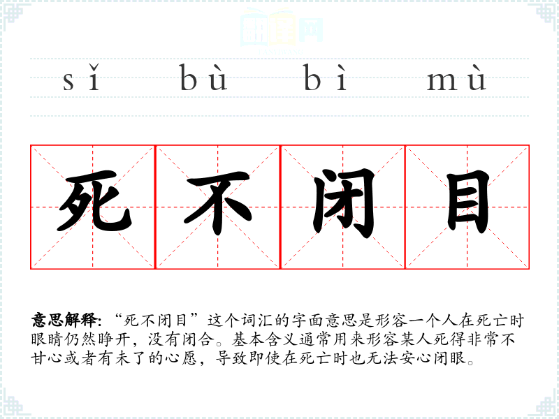 “死不闭目”这个词汇的字面意思是形容一个人在死亡时眼睛仍然睁开,没有闭合。基本含义通常用来形容某人死得非常不甘心或者有未了的心愿,导致即使在死亡时也无法安心闭眼。