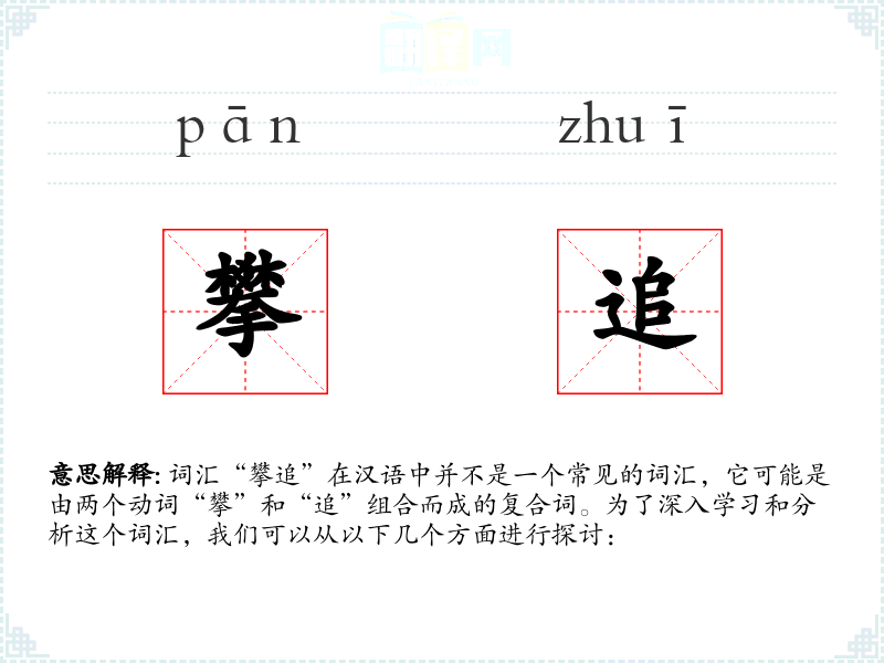 词汇“攀追”在汉语中并不是一个常见的词汇,它可能是由两个动词“攀”和“追”组合而成的复合词。为了深入学*和分析这个词汇,我们可以从以下几个方面进行探讨: