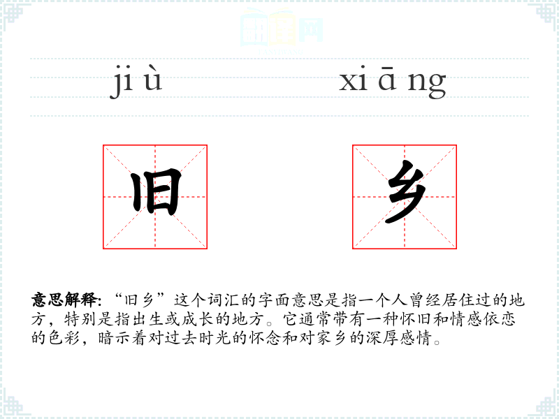 “旧乡”这个词汇的字面意思是指一个人曾经居住过的地方,特别是指出生或成长的地方。它通常带有一种怀旧和情感依恋的色彩,暗示着对过去时光的怀念和对家乡的深厚感情。