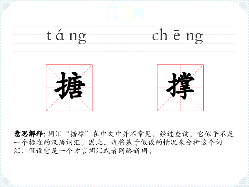 词汇“搪撑”在中文中并不常见,经过查询,它似乎不是一个标准的汉语词汇。因此,我将基于假设的情况来分析这个词汇,假设它是一个方言词汇或者网络新词。