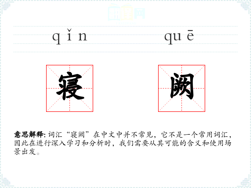 词汇“寝阙”在中文中并不常见,它不是一个常用词汇,因此在进行深入学*和分析时,我们需要从其可能的含义和使用场景出发。