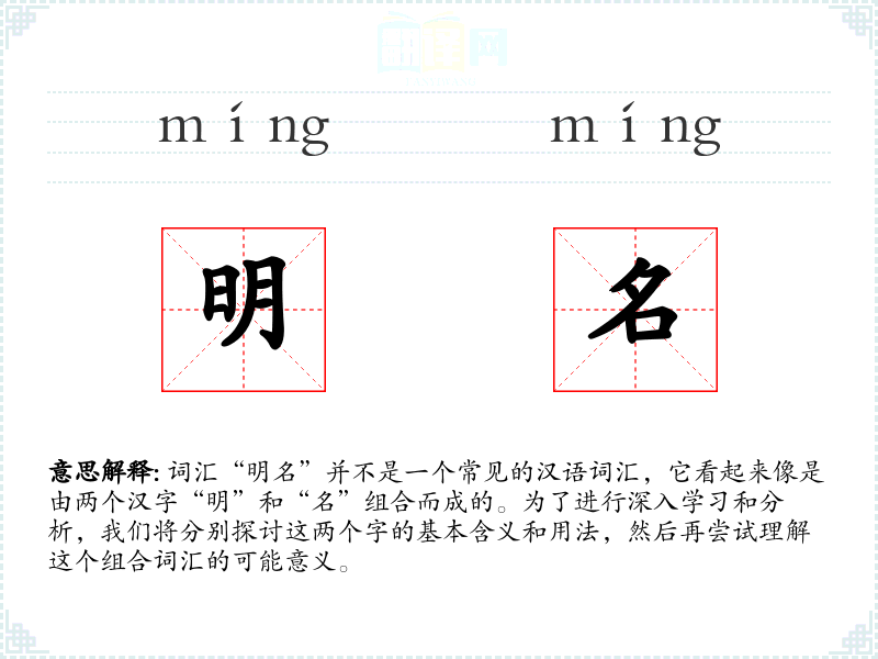 词汇“明名”并不是一个常见的汉语词汇,它看起来像是由两个汉字“明”和“名”组合而成的。为了进行深入学*和分析,我们将分别探讨这两个字的基本含义和用法,然后再尝试理解这个组合词汇的可能意义。