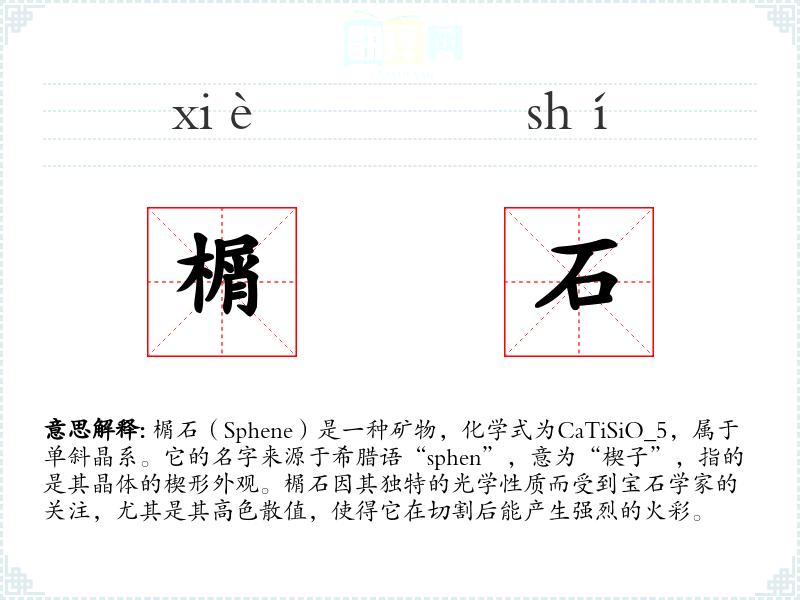 - 反义词:无,因为榍石是一个特定的矿物名称,没有直接的反义词。