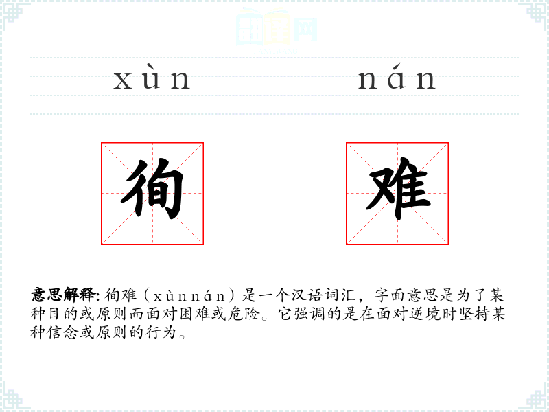 徇难(xùn nán)是一个汉语词汇,字面意思是为了某种目的或原则而面对困难或危险。它强调的是在面对逆境时坚持某种信念或原则的行为。