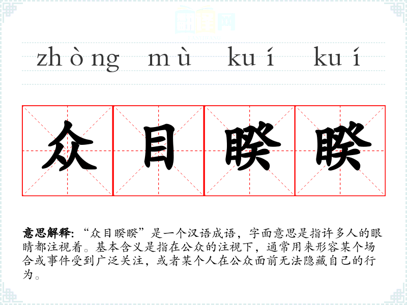 “众目睽睽”源自古代汉语,其中“众”指许多人,“目”指眼睛,“睽睽”形容眼睛注视的样子。这个成语在古代文献中已有使用,如《左传》等,至今仍广泛应用于现代汉语中。