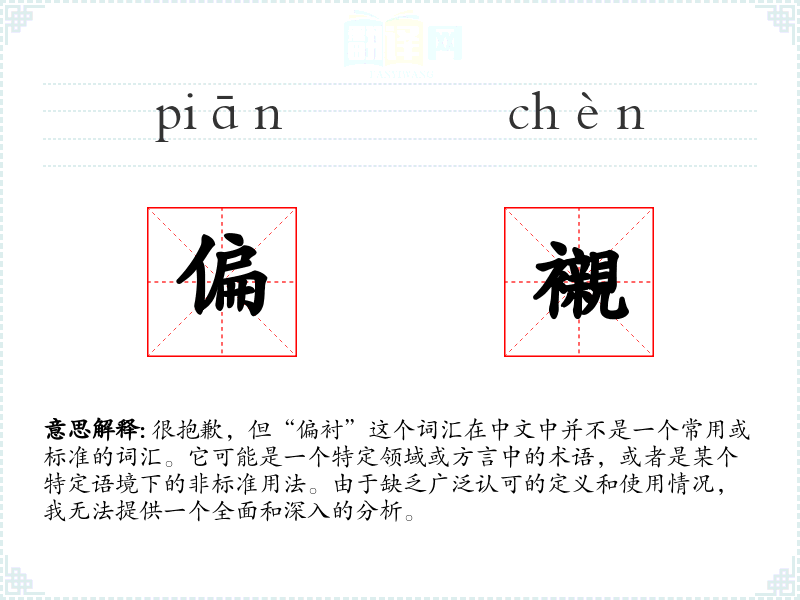 如果您能提供更多关于这个词汇的上下文或来源信息,我或许能够提供更具体的帮助。例如,如果“偏衬”是某个专业领域(如服装设计、建筑学等)的术语,或者是在某个特定地区或社群中使用的词汇,那么我可以尝试根据这些信息来分析其含义和用法。