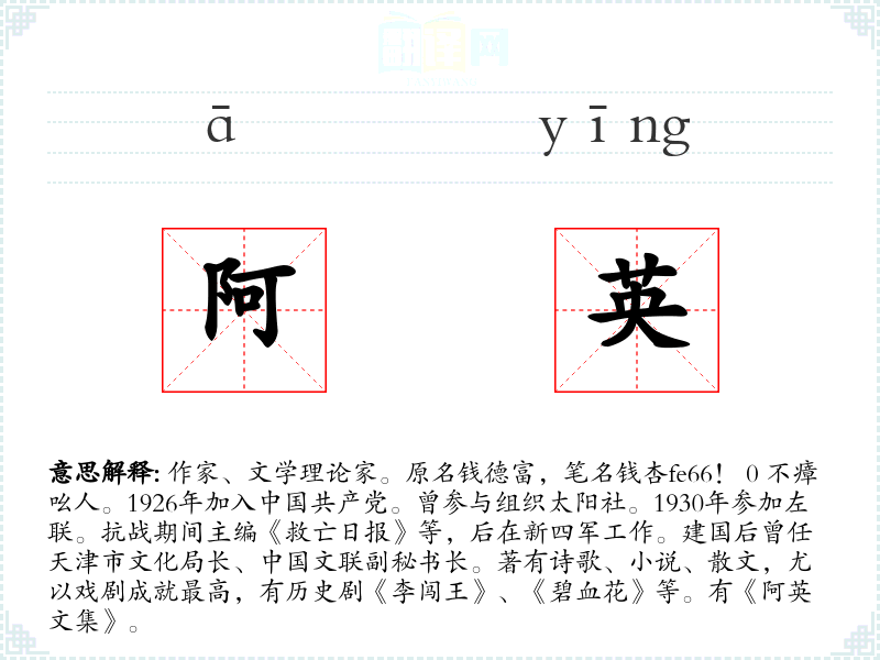 1.作家、文学理论家。原名钱德富,笔名钱杏fe66!0不瘴吆人。1926年加入中国共产党。曾参与组织太阳社。1930年参加左联。抗战期间主编《救亡日报》等,后在新四军工作。建国后曾任天津市文化局长、中国文联副秘书长。著有诗歌、小说、散文,尤以戏剧成就最高,有历史剧《李闯王》、《碧血花》等。有《阿英文集》。