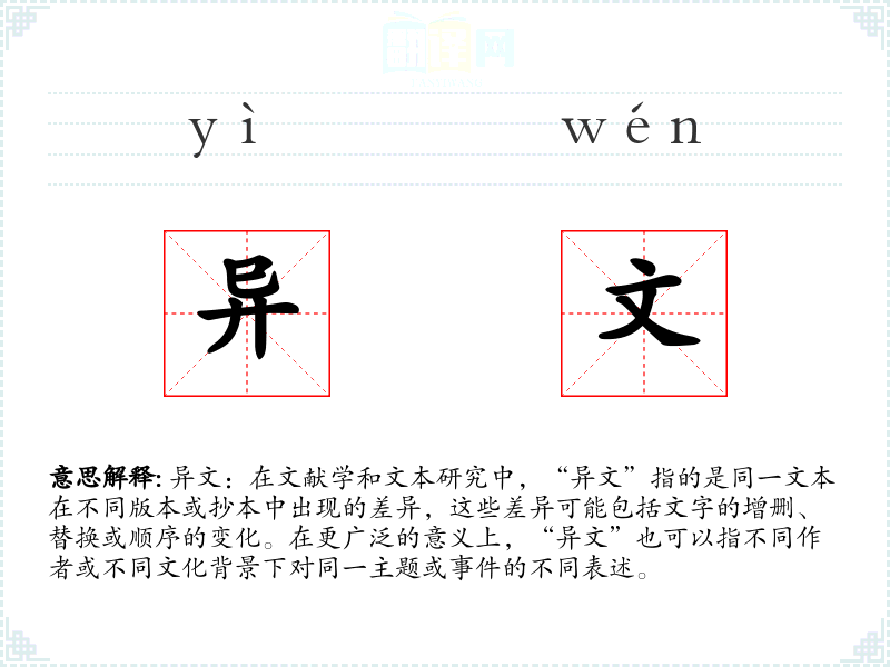 异文:在文献学和文本研究中,“异文”指的是同一文本在不同版本或抄本中出现的差异,这些差异可能包括文字的增删、替换或顺序的变化。在更广泛的意义上,“异文”也可以指不同作者或不同文化背景下对同一主题或**的不同表述。
