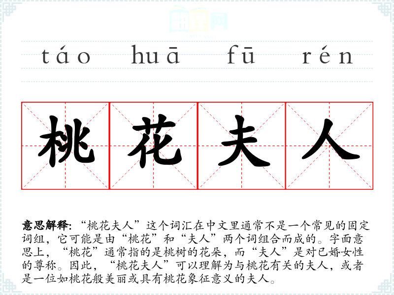 “桃花夫人”这个词汇并没有特定的词源或历史演变记录,它可能是现代文学创作中的一个临时组合词。