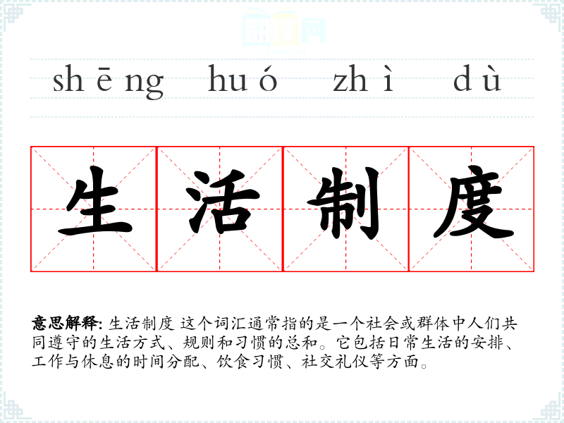 生活制度 这个词汇通常指的是一个社会或群体中人们共同遵守的生活方式、规则和习惯的总和。它包括日常生活的安排、工作与休息的时间分配、饮食习惯、社交礼仪等方面。