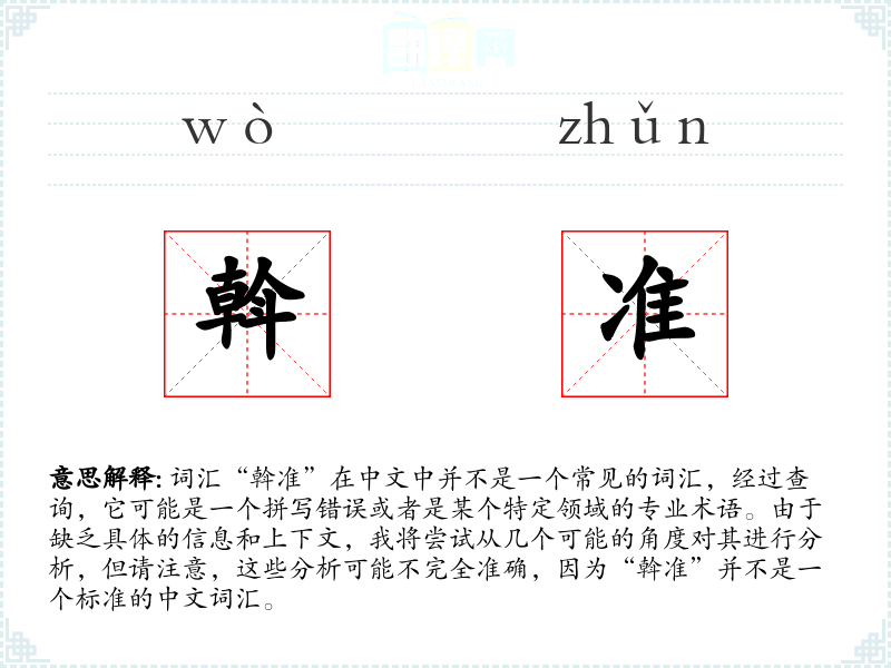 总之,由于“斡准”不是一个标准的中文词汇,我们无法提供详细的分析。如果它是一个特定领域的术语,可能需要专业知识才能进行深入研究。