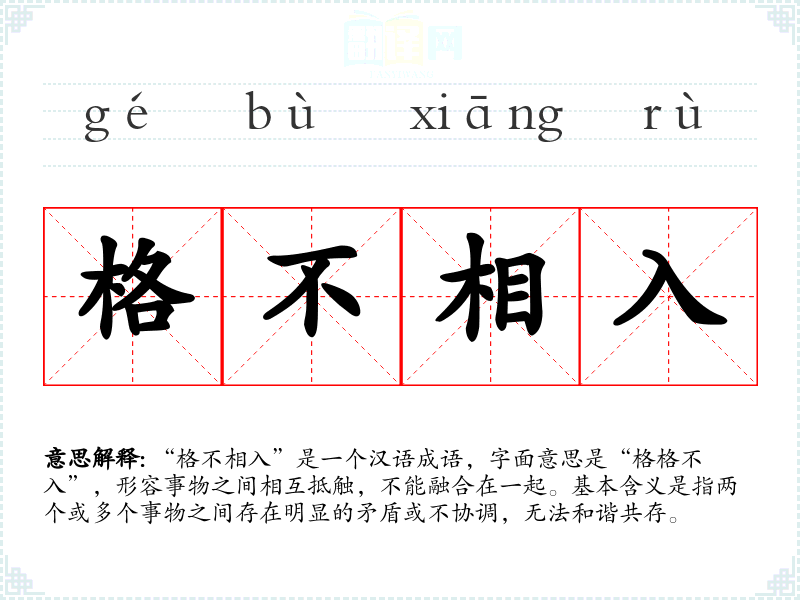 “格不相入”是一个汉语成语,字面意思是“格格不入”,形容事物之间相互抵触,不能融合在一起。基本含义是指两个或多个事物之间存在明显的矛盾或不协调,无法和谐共存。