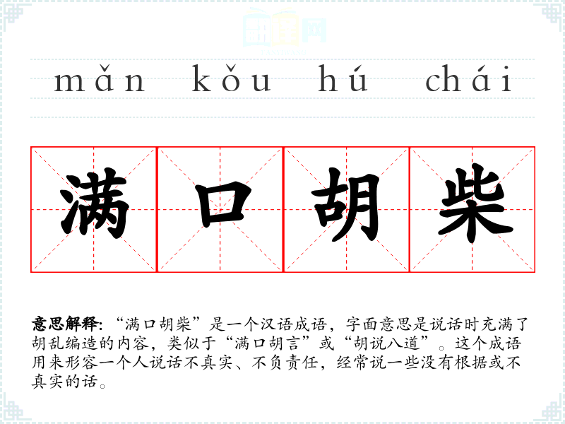 “满口胡柴”是一个汉语成语,字面意思是说话时充满了胡乱编造的内容,类似于“满口胡言”或“胡说八道”。这个成语用来形容一个人说话不真实、不负责任,经常说一些没有根据或不真实的话。