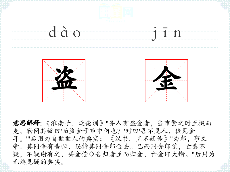 1.《淮南子.泛论训》"齐人有盗金者,当市繁之时至掇而走,勒问其故曰'而盗金于市中何也?'对曰'吾不见人,徒见金耳。'"后用为自欺欺人的典实; 《汉书.直不疑传》"为郎,事文帝。其同舍有告归,误持其同舍郎金去。已而同舍郎觉,亡意不疑,不疑谢有之,买金偿◇告归者至而归金,亡金郎大惭。"后用为无端见疑的典实。
