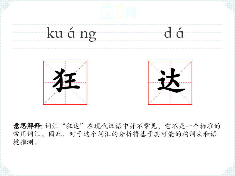 词汇“狂达”在现代汉语中并不常见,它不是一个标准的常用词汇。因此,对于这个词汇的分析将基于其可能的构词法和语境推测。