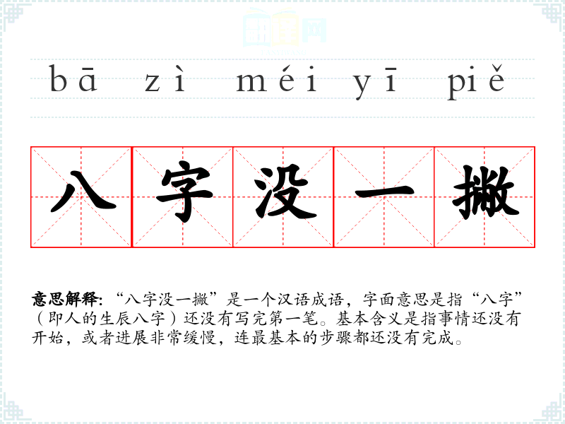 “八字没一撇”是一个汉语成语,字面意思是指“八字”(即人的生辰八字)还没有写完第一笔。基本含义是指事情还没有开始,或者进展非常缓慢,连最基本的步骤都还没有完成。