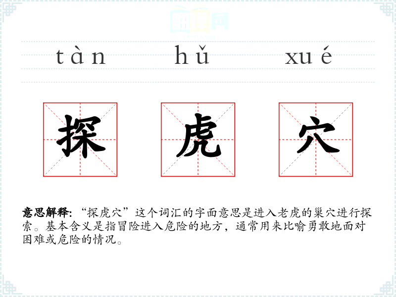 “探虎穴”这个词汇源自古代的成语,原意是指进入的巢穴,后来逐渐演变为比喻义,用来形容勇敢面对危险的行为。