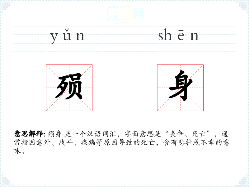 殒身 是一个汉语词汇,字面意思是“丧命、死亡”,通常指因意外、战斗、疾病等原因导致的死亡,含有悲壮或不幸的意味。