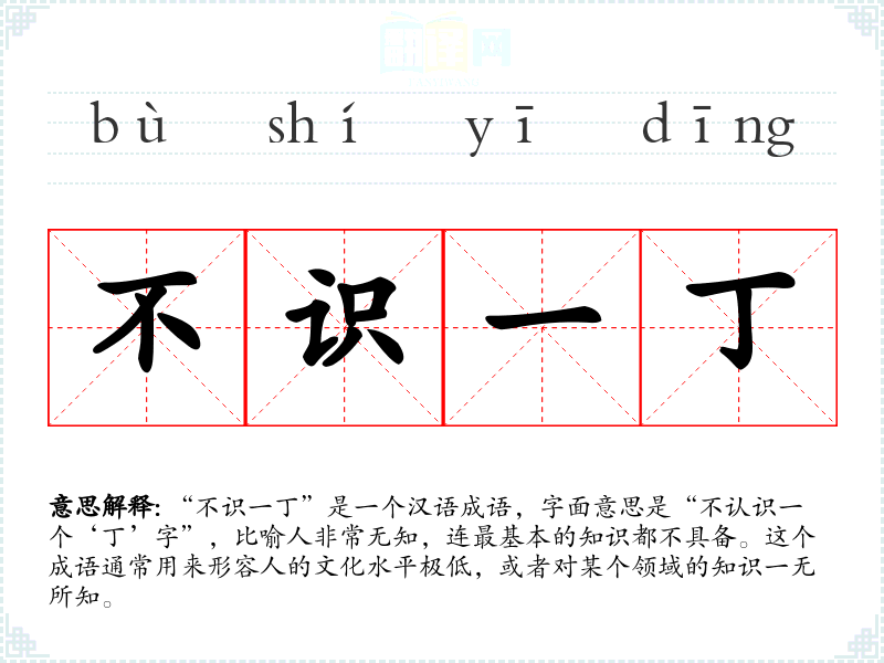 “不识一丁”是一个汉语成语,字面意思是“不认识一个‘丁’字”,比喻人非常无知,连最基本的知识都不具备。这个成语通常用来形容人的文化水平极低,或者对某个领域的知识一无所知。